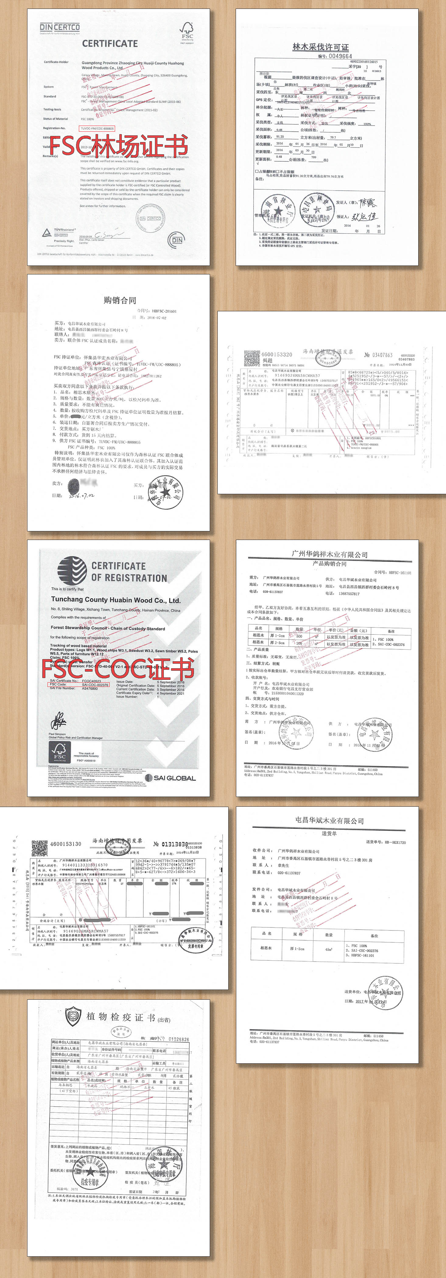 FSC供应链:FSC林场(FSC-FM证书、采伐证、合同、发票) —— FSC板材供应商(FSC-COC证书、合同、发票、送货单、检疫证) —— 广州华鸽祥